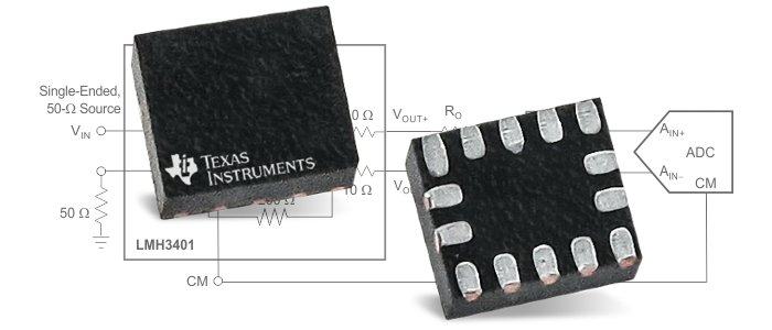 The LMH3401, a fully differential amplifier optimized for RF applications. Image used courtesy of Texas Instruments