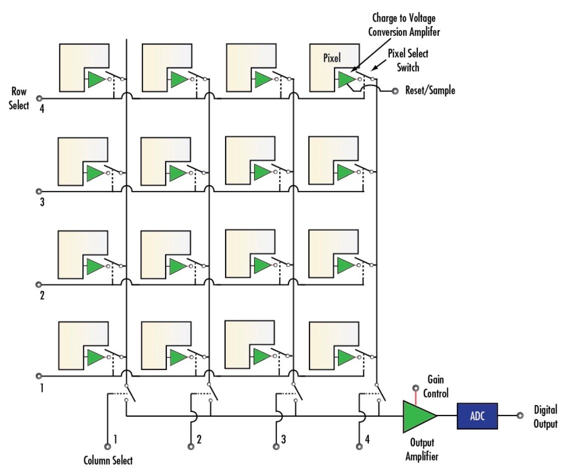 A two-dimensional array of photo-detectors is used to sense the incident light intensity. The charge created by a photo-detector is converted to a voltage signal and passed on to the output amplifier through an array of “row select” and “column select” switches. An ADC is used to digitize the amplified signal.