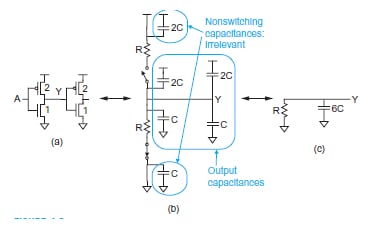 This means, in a rise/fall transition, the effective resistance of the equivalent RC circuit is “R”. Meanwhile, the total capacitance of each transistor (3C) does not change with the transistor. Since we have two inverters cascaded together, they give a total of 6C capacitance.