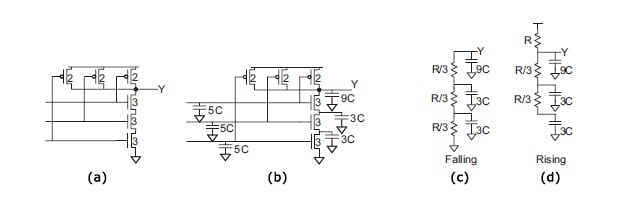 The fall transition (2(c)) shows that all the NMOS transistors need to be switched ON while the rise transition (2(d)) shows a worst-case where one PMOS is switched ON while two NMOS transistors are ON, as well, contributing to the total capacitance of the circuit.