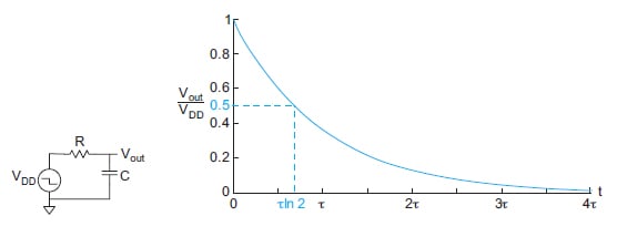 The time between when the input (VDD) is applied and when the output is is known as the propagation delay. The expression of the propagation delay can be derived from the classical transfer function of a first-order circuit given as:
