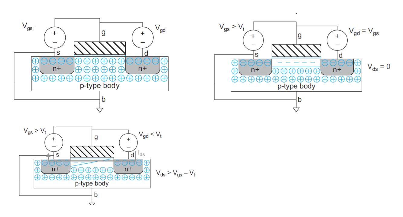 If a small gate voltage (Vgs < Vt) is applied, this voltage level is called subthreshold voltage level and the transistor is still assumed to be OFF (no conduction). But if a voltage high enough to get its carrier (electron or holes) moving is applied (Vgs > Vt), it creates a channel between the drain (d) and the source (s), hence making the drain-source current (Ids) to flow. At this point, the transistor is said to be in the ON (active) state, for example. This is similar to whenever you turn ON your smartphone.