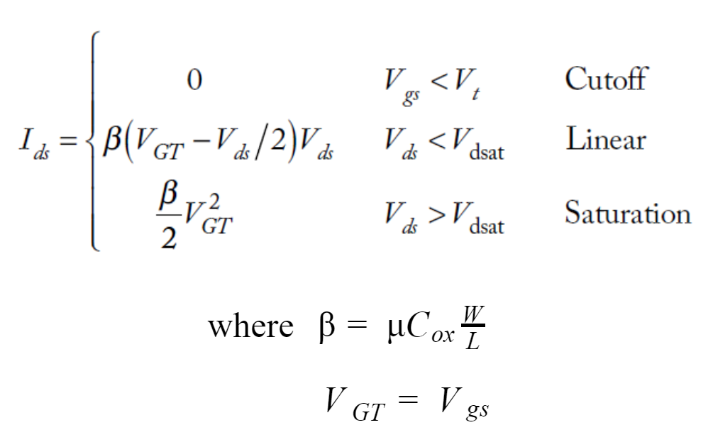 Consequently, this illustration is termed as the long channel model and the drain-source current for a transistor whose gate is of length (L) and width (W) is given by