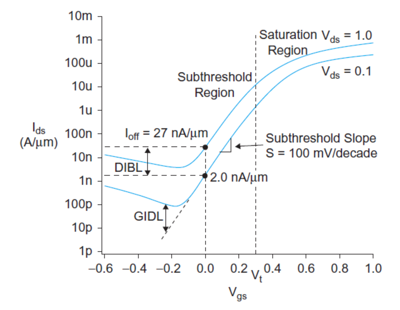 For subthreshold leakage, it is assumed that the current Ids are zero when Vgs < Vt, but in reality, the current drops faster in this operating condition. As Vgs lowers to a negative value, it forms what is called weak inversion as shown in Figure 3: