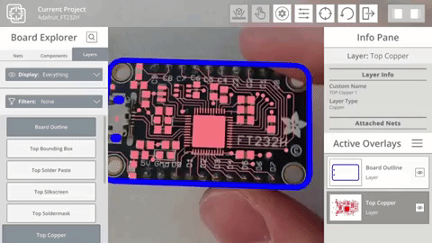 As the user moves the board, the overlay tracks precisely. The user can flip the board over and the app will show all the nets, components, and layers through the user’s screen.