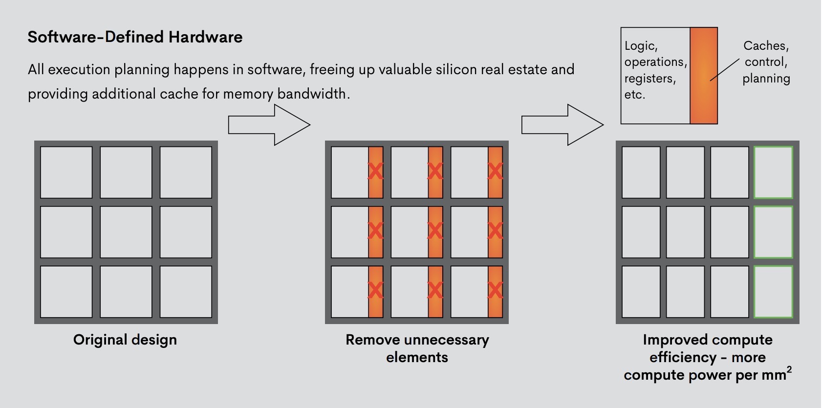 A representation of Groq's software-defined hardware concept for improved compute efficiency. Image from Groq's whitepaper "Tensor Streaming Architecture Delivers Unmatched Performance for ComputeIntensive Workloads"
