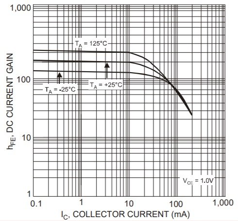 All of the hFE vs. IC plots have different curves for different temperatures. This tells us that beta is influenced not only by collector current but also by temperature.