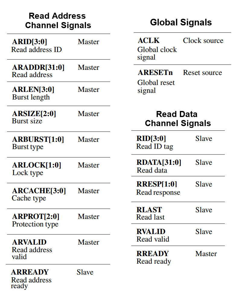 Much like the AHB, ASB, and APB signals from the previous AMBA revision, each of the AXI channels has a number of signals associated with it. There are two global signals referred to as ACLK and ARESETn. These are the system's global clock and reset signal, respectively. The 'n' suffix on ARESETn means this signal is active low.