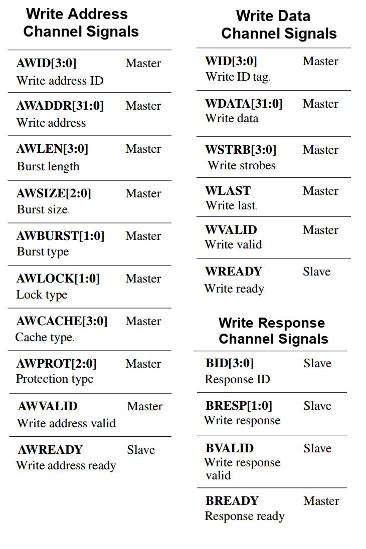 Figure 3 shows the write address, data, and response signals. These signals mirror the read signals above but are used by the master to send data to a slave. WLAST signals to the slave that the last data item is being sent. The dedicated write response signals allow for a master to know that the write transaction completed successfully.