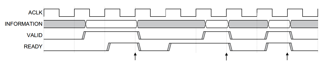Figure 4 shows AXI handshaking at work. Notice information transfer (denoted by an arrow) only occurs when both VALID and READY are high, regardless of which was asserted first. Also note that AXI uses the rising clock edge for all transfers.