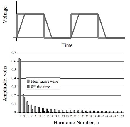 For example, by visual inspection of Figure 3, we observe that the 7th harmonic is attenuated by a factor greater than 0.7 (compared to the same harmonic of the ideal square wave). Hence, this harmonic is not significant. However, the 5th harmonic seems to be significant by the above definition. Therefore, the bandwidth of this trapezoidal waveform extends from DC to the 5th harmonic. If the waveform period is 10 ns, the fundamental harmonic will be 100 MHz and the bandwidth will be 500 MHz.