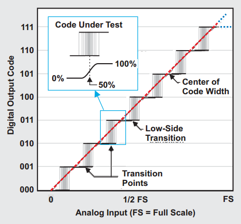 The transfer characteristic of a three-bit ADC is shown in Figure 1.