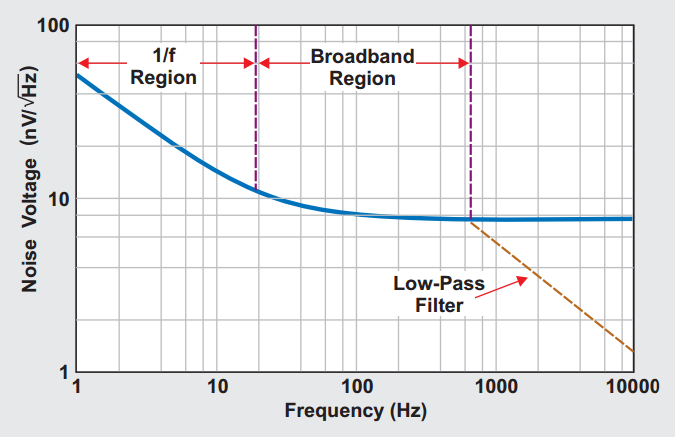The most useful way is to provide the plot of the noise voltage spectral density () versus frequency (as seen in Figure 2 below). Note the 1/ƒ and broadband noise regions shown in Figure 2.