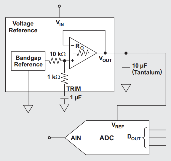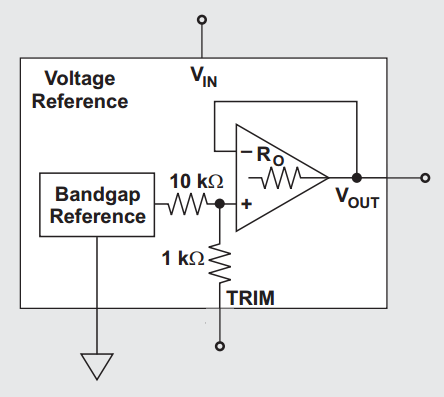 There are two main noise sources: the bandgap reference and the output buffer/amplifier. As you can see, the TRIM terminal in Figure 3 is connected to the output of the bandgap block. This allows us to connect an external capacitor to the TRIM terminal and create a low-pass filter at the output of the bandgap circuitry.