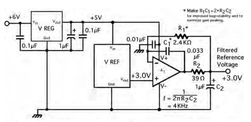 Note that, as shown in Figure 6, we can use a low-cost, linear voltage regulator to create a clean supply voltage for both the reference and the op-amp. Additionally, choosing R1C1=2R2C2 improves the loop stability of the filter.