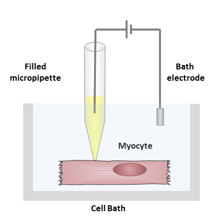 A very simplified rendering of a patch clamp setup. Image used courtesy of PeaBrainC [CC BY-SA 4.0]