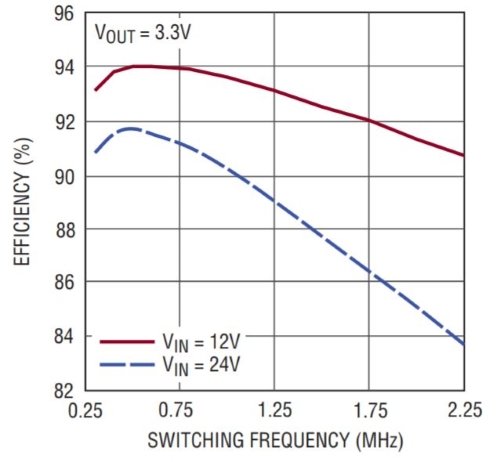 A plot showing efficiency vs frequency for a step-down switching regulator. Plot taken from the datasheet for the LT8610 from Linear Tech/Analog Devices.