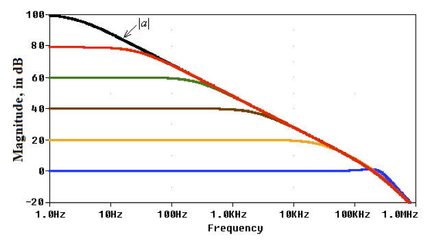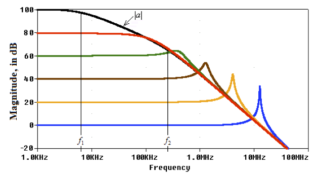 Rerunning the circuit of Figure 2, but with Cc added as in Figure 4 (below), we obtain the plots of Figure 5. Except for the unity-gain case, all profiles are now exempt from peaking because each enjoys a 90° phase margin.