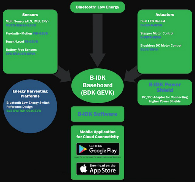 Like the SensorTile, this platform leverages Bluetooth 5 connectivity, in this case via ON Semi's RSL10 Bluetooth 5 radio SoC (system on chip) across modular hardware—a chip ON claims is the lowest-power of its kind on the market. The mobile app ON developed for this board both controls the hardware and allows the use of the MQTT protocol for sensors and mobile data through various cloud services.