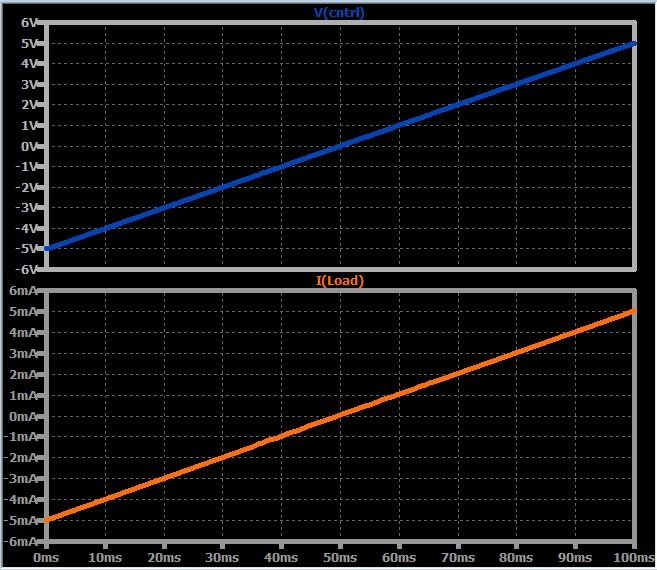 The plot below shows you how the current source reacts to a slowly changing input voltage. As expected, the load current increases linearly from –5 mA to +5 mA.