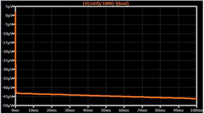 We can estimate the circuit’s low-frequency precision by applying the mathematical transfer function to the control voltage and then plotting the difference between the theoretical output current and the simulated output current.