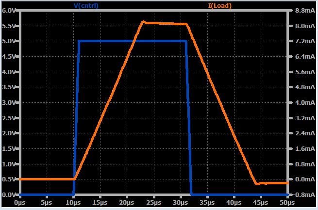 One interesting detail that I noticed is shown in the following plot. After the falling edge, the output current takes a (relatively) long time to return to the expected value of 0 mA.