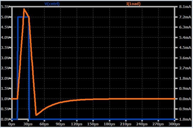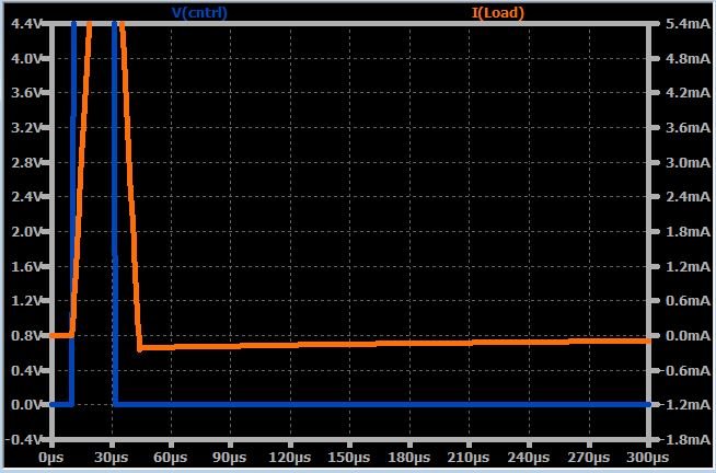 To simulate the dynamic response, I changed the voltage source to a pulse that transitions from 0 V to 5 V with a rise/fall time of 1 µs. The input signal is shown below, along with the resulting output-current signal.