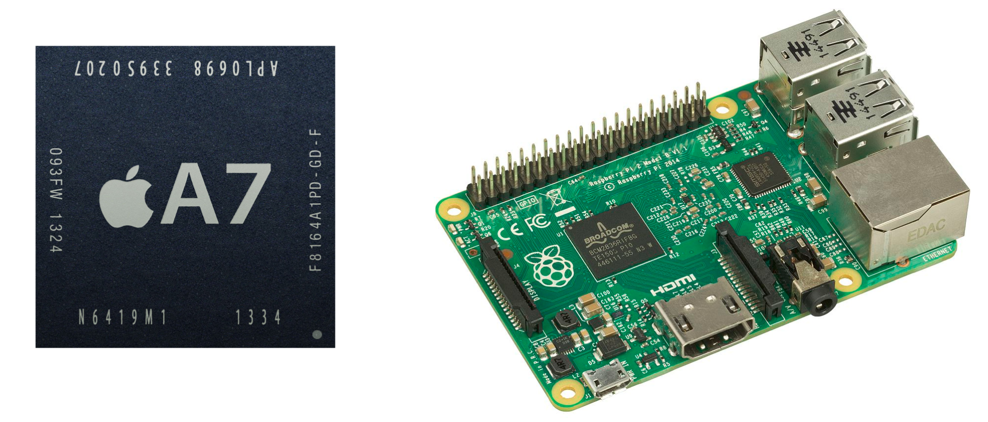 The Apple A7 and Raspberry Pi both use implementations of the Armv8 architecture. Images courtesy of Wikipedia's Apple_A7 and Raspberry_Pi articles.