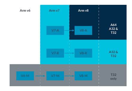 To maintain compatibility with earlier versions, Armv8 introduced two new execution states: AArch32 and AArch64. These are effectively 32-bit and 64-bit modes, respectively. In the AArch32 state, the A32 and T32 instructions sets are used, while AArch64 uses A64.