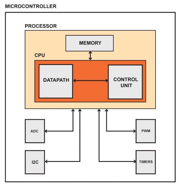 The CPU performs arithmetic operations, manages data flow, and generates control signals in accordance with the sequence of instructions created by the programmer. The extremely complex circuitry required for CPU functionality is not visible to the designer. In fact, thanks to integrated development environments and high-level languages such as C, writing code for microcontrollers is often a fairly straightforward task.