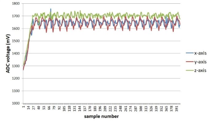 This plot shows three-axis accelerometer data that I digitized using a microcontroller’s on-chip ADC.