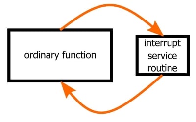 Microcontroller programs written in C are organized into functions. An interrupt causes program execution to “vector” to an interrupt service routine (ISR), and after the ISR has completed its tasks, the processor returns to the function that was executing when the interrupt occurred.