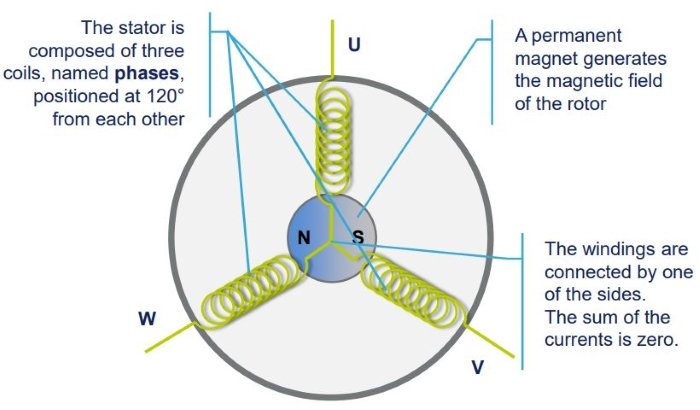 This graphic, taken from an STMicro document entitled “An Introduction to Electric Motors,” gives you a basic idea of the structure and operation of a three-phase brushless DC motor.