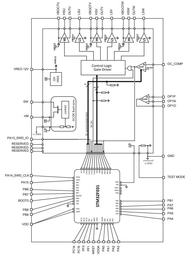 The STSPIN32F0B from STMicroelectronics is a system-in-package that includes a microcontroller, a gate driver, a DC/DC converter, a linear regulator, and an operational amplifier.