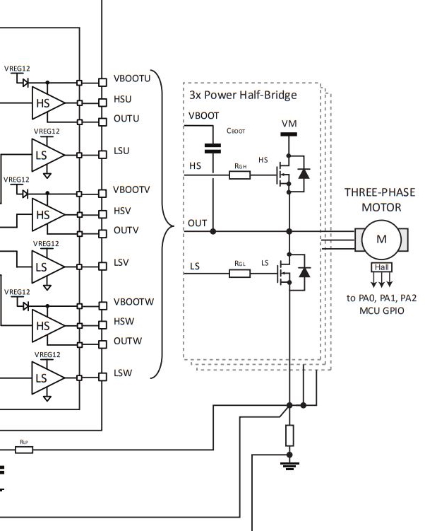 The STSPIN32F0B provides gate-drive outputs, not motor-drive outputs. As shown in the application example on page 27 of the datasheet, the final system must include three half-bridge drivers (one per motor phase). Each half-bridge uses two N-channel MOSFETs, as shown in the diagram below.