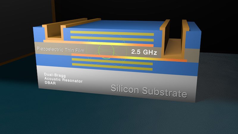 Bulk acoustic wave moves signals vertically, with a piezoelectric thin film sandwiched between two electrode layers that serve as acoustic mirrors. When a frequency is introduced into the device, the structure resonates at 2.5Ghz. This resonator structure stores the maximum acoustic energy, doing so with a high electrical Q. The mechanical vibration is then converted and output as a low-noise electrical signal.
