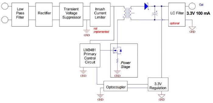 For those who wish to avoid transformerless power supplies, the topology described above still forms the basis of an AC to DC converter. However, various beneficial features can be incorporated, and we can make the circuit more efficient by delivering rectified and smoothed voltage to a switching regulator instead of a Zener diode or a linear regulator.