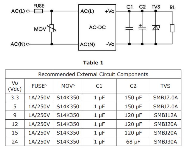 However, the datasheet does have helpful application circuits. The basic implementation, shown in Figure 1 on page 7, recommends that the module be complemented by a fuse, a metal oxide varistor, two output capacitors, and a transient voltage suppressor diode. This figure is even accompanied by a table that provides specific recommendations for the external components.