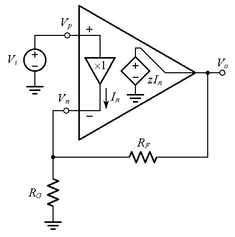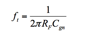 In a well-designed CFA, Rgn is on the order of 106 Ω, Cgn is in the picofarad range, and RF is on the order of 103 Ω. The time constant τ = (RFCgn) is then in the nanosecond range.