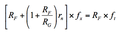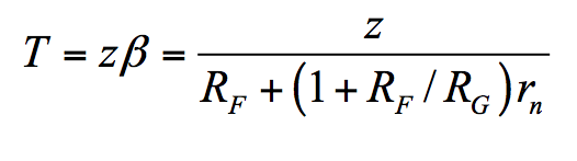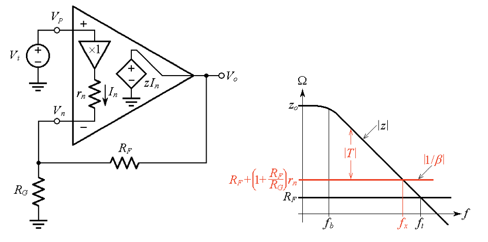 The presence of rn has no effect upon Aideal. However, it raises the 1/ß curve, and in so doing it reduces both the loop gain T and the crossover frequency fx, compared to the idealized case rn = 0, for which T = z/RF and fx = ft. (Henceforth, we visualize ft as the crossover frequency extrapolated to the limit rn → 0.)
