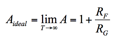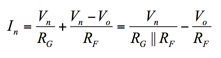 Substituting Equation (3) into Equation (2), we eliminate Vn. Collecting for In and then substituting into Equation (1), we eliminate In to obtain an expression involving only Vo and Vi. Collecting once again and solving for the ratio Vo/Vi gives the closed-loop gain A, which we express as