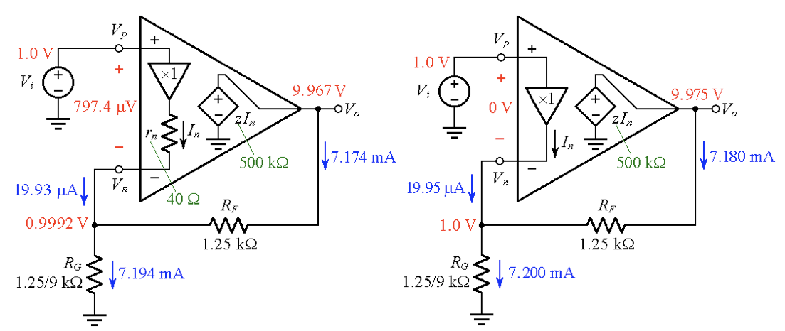 Moreover, we calculate the currents through RG and RF via Ohm’s law. The results are visualized in Figure 3a (for easy comparison, the example from the previous article is repeated in Figure 3b).