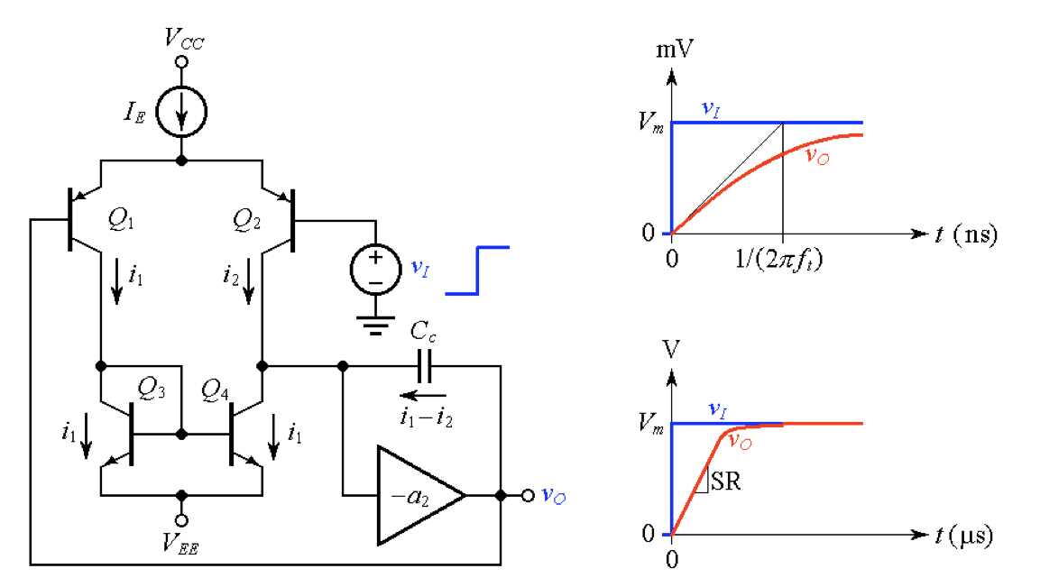 When vO = vI, the circuit is said to be balanced because i1 = i2, so the capacitor current is i1 – i2 = 0. If we now apply an input step of suitably small magnitude Vm, we are making Q2 less conductive and Q1 more conductive, thus unbalancing the circuit to give i1 – i2 > 0. This will cause Cc to charge up and produce a transient at the output, which in turn will gradually reduce the initial imbalance via negative feedback. Just as in the case of a plain R-C network, we get an exponential transient, and its time constant is τ = 1/(2πft), as shown in Figure 5b, top. (For the 741 op-amp, which has ft = 1 MHz, we have τ = 159 ns.)