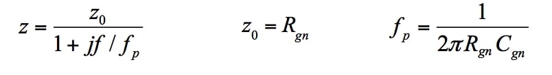 - The impedance is modeled as the parallel combination of equivalent resistance Rgn and capacitance Cgn, or z = Rgn||[1/(j2πfCgn)]. Expanding,
