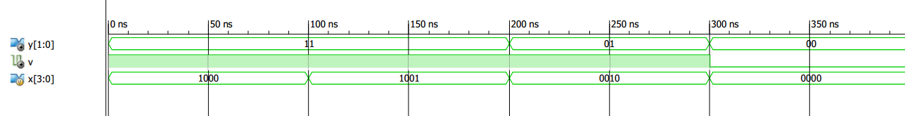 For x[3]=1, we don’t care about the value of the other three input bits (x[2], x[1], x[0]). Hence, there are eight different values that lead to “y”=11, “v”=1. These eight different values separated by a comma can be listed as a single branch of the “case” statement. This is shown in the following example which is the Verilog code for the above 4-to-2 priority encoder: