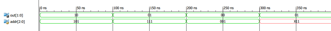 13 endWhen “addr” is 001 or 011, “out” should be 00. Now, assume that “addr” is x11. What branch will be selected by the “casex” statement? You may say that none of 101, 111, or 0?1 match x11 so the default branch should be chosen and "out" should be 00. However, as mentioned above, the bit locations that contain z or x values will be masked no matter they are in the branch expression or in the expression within the parentheses after the “casex” statement. Therefore, the comparisons will ignore the MSB (because addr=x11) and the other two bits will determine the case branch. Hence, out=2’b01 (this corresponds to the first branch that leads to a match when ignoring the MSB). Figure 3 below shows an ISE simulation of this example.