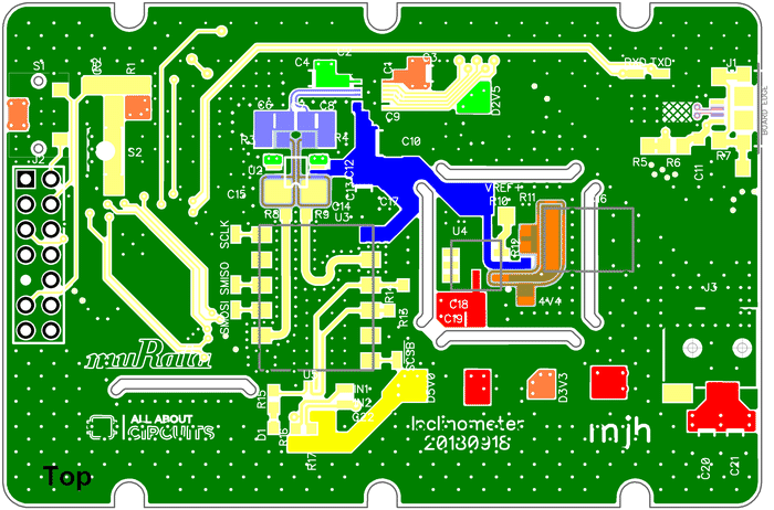 I routed the inclinometer’s two analog output signals such that they have identical trace lengths, used rounded corners, and surrounded the traces with via stitching. These features are not necessary, but they were easy to incorporate and would be worthwhile if they provide even a small improvement in signal quality.