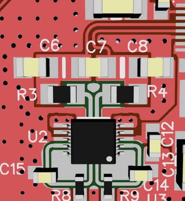 The signal traces encounter R8 and R9, 5.11 kΩ 0.1% resistors that form part of the first low-pass filter. The package size of those resistors is just large enough to allow a guard trace to pass between the pads. The guard trace, which is connected to the output of the buffer, reduces the (already very low) leakage current through the solder mask. This is complete overkill for this board, but guard rings are free and I was trying to do everything I could to maximize the precision of the inclinometer measurements.