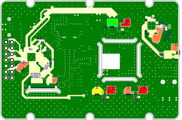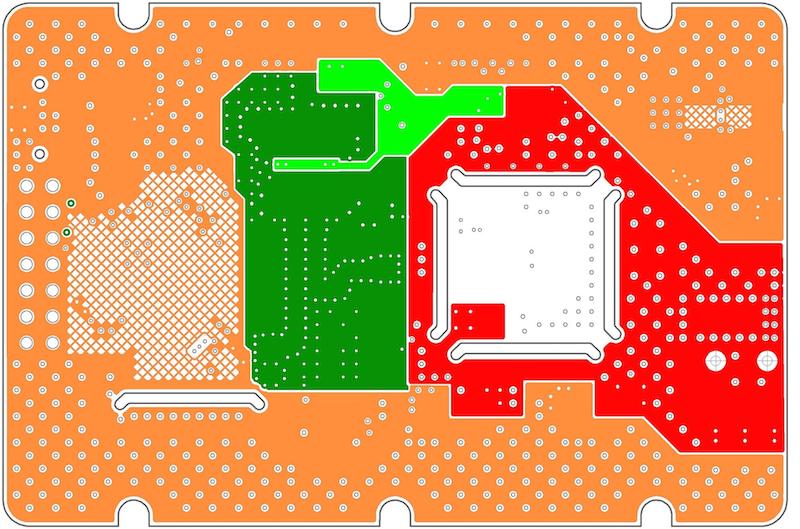 The second layer of the PCB has the 9–12VDC input net (red), the ground net (dark green), the 2.5VDC net (light green), and the 3.3V net (orange). This layer demonstrates several decisions that affect the quality of design.