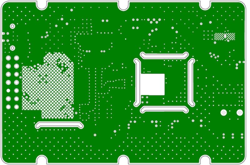 The third layer of the PCB is one large ground pour. Hatched fills are again present for the MSP430 capacitive touch lines and the USB data lines, but otherwise this layer is rather unremarkable.